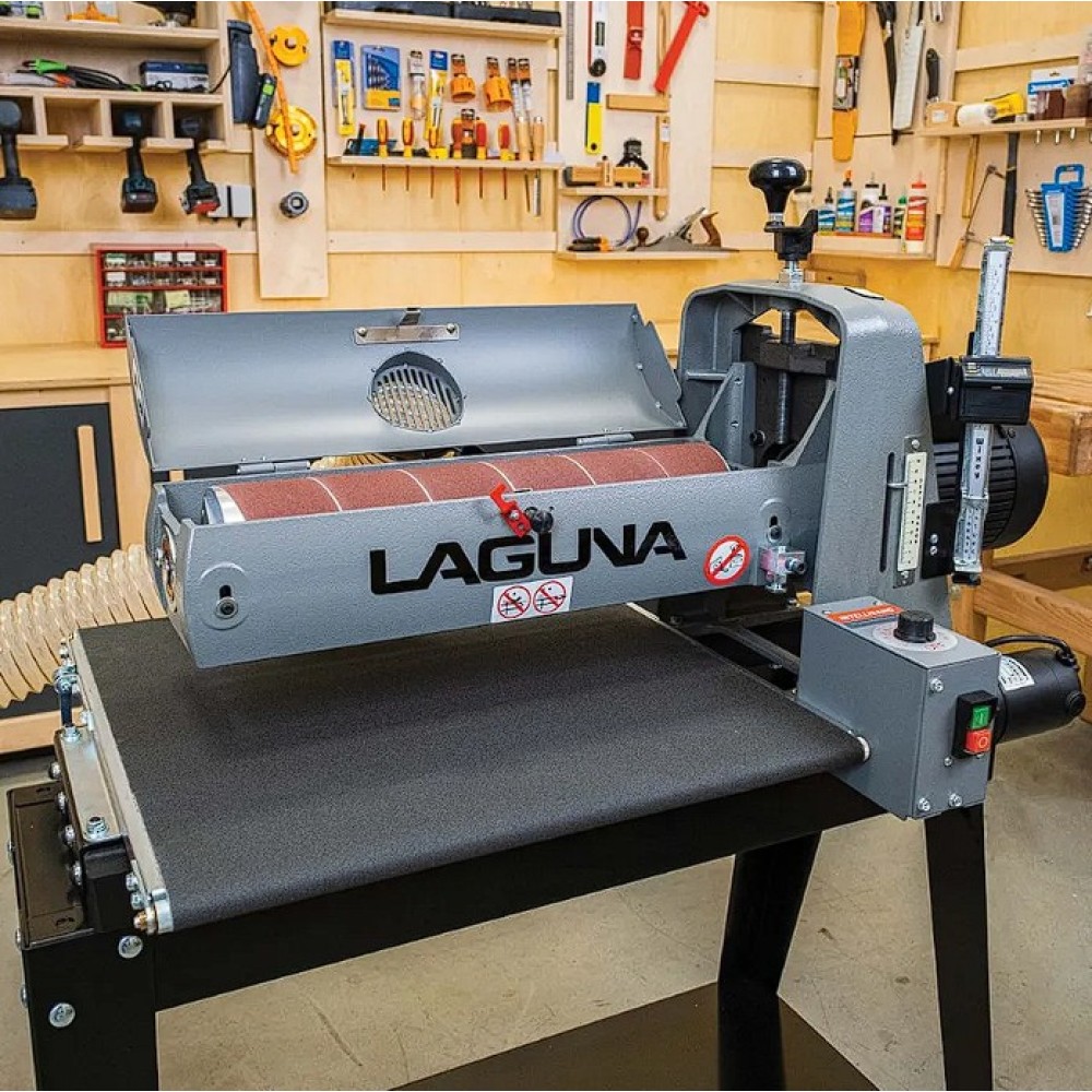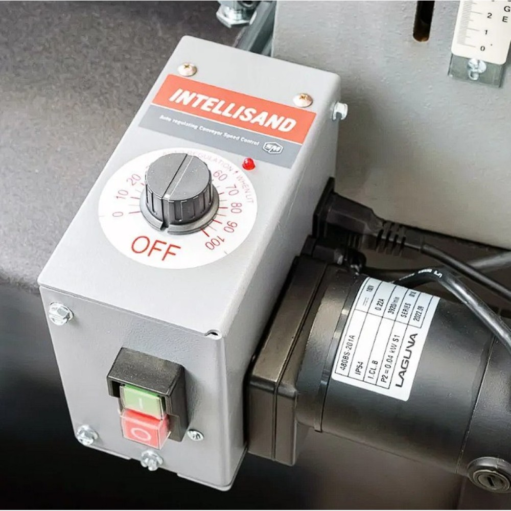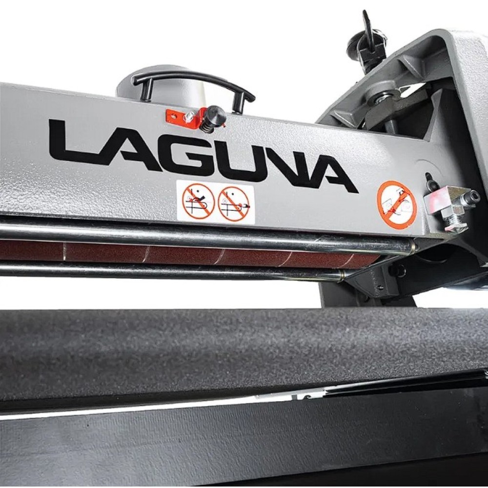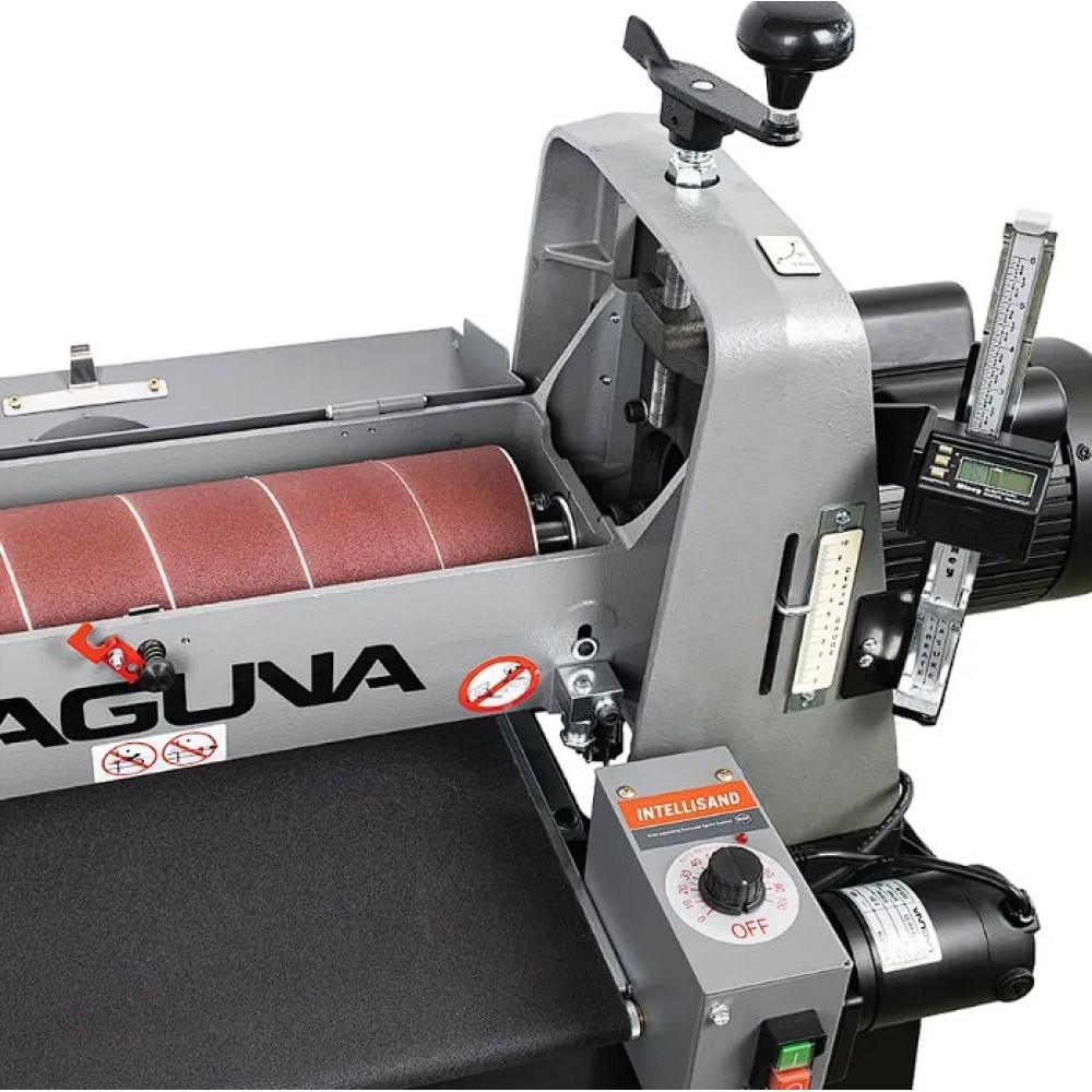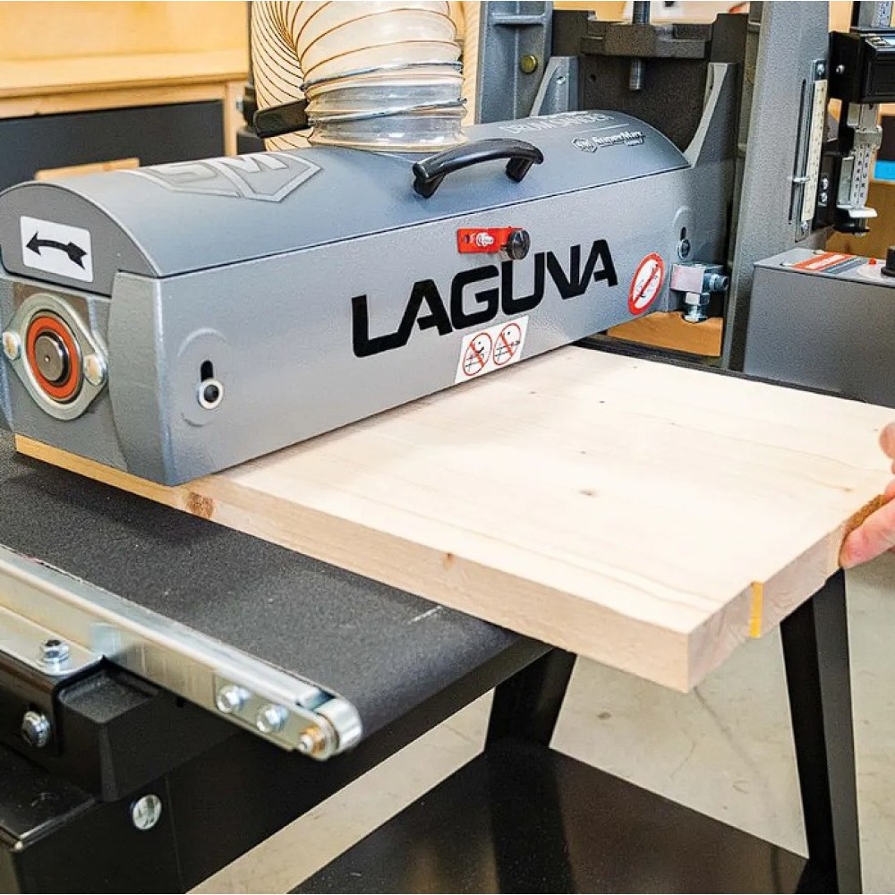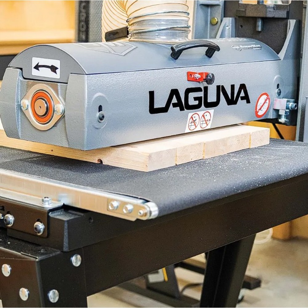 Az IGM Laguna SuperMax hengeres csiszológépet asztalosmesterek segítségével tervezték igényes műhelyek számára, zökkenőmentes működésre, keskeny vagy széles munkadarabok pontos csiszolására és gyors beállítására. Olyan elemeket talál rajta, amelyeket a szakemberek már hosszú ideje kerestek a famegmunkáló piacon. Az egyik ilyen előny például a csiszolási magasság egyszerű beállítása. A kar alatti nyomócsapágy és a felette lévő anya megakadályozza, hogy a henger csiszolás közben elmozduljon. A magasságállító mechanizmusnak nincs holtjátéka vagy billenése, így könnyebb és simább a magasság beállítása. A pontos anyagleválasztást beépített digitális kijelző segítségével lehet ellenőrizni, amely tizedmilliméter pontossággal mutatja a henger magasságát, ezáltal lehetővé téve a pontos érték kiszámítását. A teljes munkadarab szélességén belüli pontosságot nemcsak a merev öntöttvas szerkezet garantálja, hanem a henger és a szállítószalag közötti pontos párhuzamos beállítás is. A csiszológép fel van szerelve egy karral, amellyel be lehet állítani a gépet a széles munkadarabok csiszolásához. Ez a kar kissé megemeli az adagolóasztalt, így elkerülhető a hornyok kialakulása az alkatrésznek a hengeren túlnyúló részén. A vivőszalag önálló motorja a csiszológép hátoldalán található, így a szalag inkább húzva van, nem pedig tolva. A csúszásgátlós abrazív vivőszalagot úgy tervezték, hogy a 482 mm-nél szélesebb munkadarabokat is megfelelően támassza alá (két csiszolási művelet során). Az adagolószalag négy acél keresztmetszettel megerősített, tökéletesen sík acélvezetője 0,25 mm-nél kisebb eltéréssel garantálja a simaságot a csiszológép teljes szélességében. Az Intellisand technológia automatikusan beállítja az adagolási sebességet, ha túl nagy az anyagleválasztás. Az Intellisand csökkenti az adagolási sebességet, hogy megelőzze a motor túlterhelését, és elkerülje a munkadarab megégését, a szálak kitépését vagy más sérülést. A durva felületű adagolószalag szorosan tartja a nyers fát, és lehetővé teszi a nagyon rövid vagy vékony darabok csiszolását is. A csiszológép szabadalmaztatott csiszolószalag-rögzítő rendszerrel rendelkezik, amely megakadályozza a csiszolószalag meglazulását vagy átfedését. A feszesség beállítása így nagyon egyszerű és gyors – semmi speciális szerszám nem szükséges! Egy másik intelligens tulajdonság a speciálisan kialakított hengerfedél, amely hatékonyabbá teszi a csiszolópor elszívását. A burkolat úgy van kialakítva, hogy a tökéletes elszívás érdekében illeszkedjen a henger formájához. Az önhűtő henger megakadályozza a túlmelegedést, és meghosszabbítja a csiszolóanyag élettartamát. A szabályozható nyomógörgők megakadályozzák az eltérő anyagleválasztást az egymást követő csiszolási folyamatok során. A hengeres csiszológép az anyag felületének megmunkálására szolgál. Egyetlen csiszolási művelet során (60-as csiszolóanyaggal) nem szabad túllépni a 0,4 mm-es anyagleválasztást.