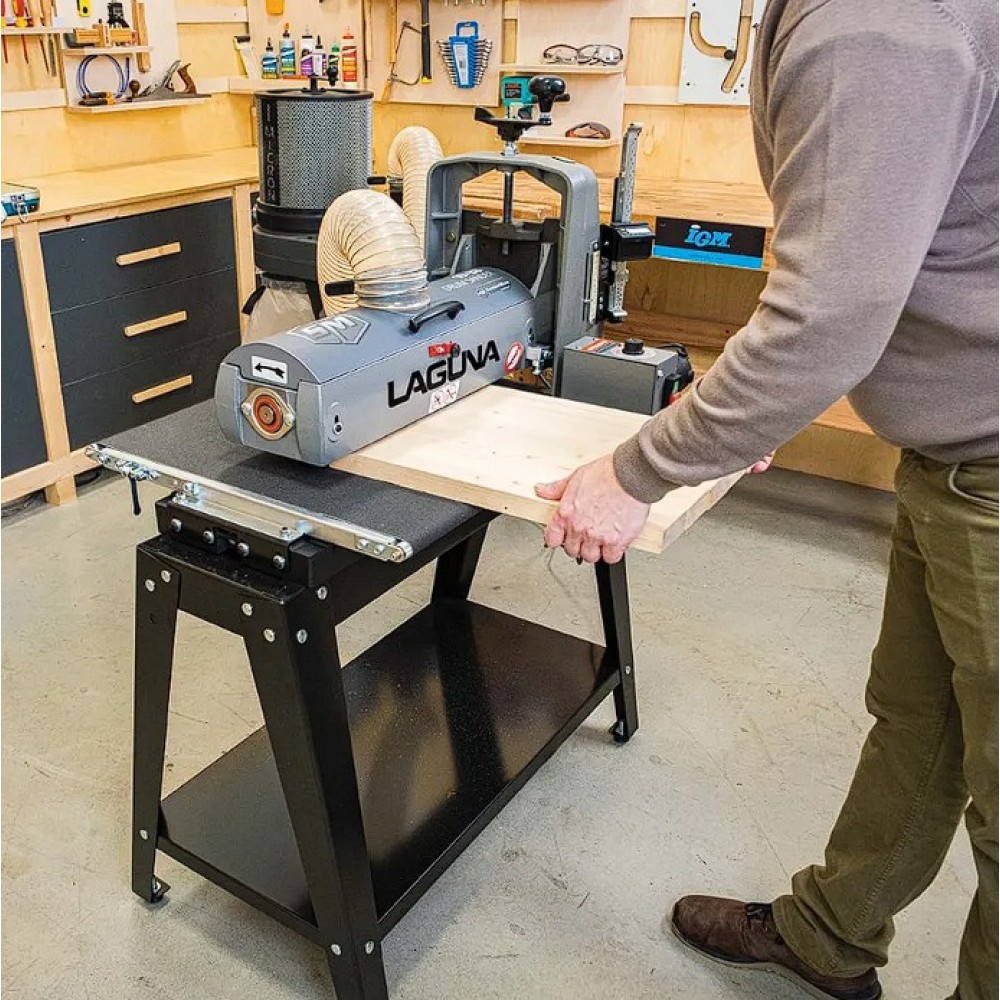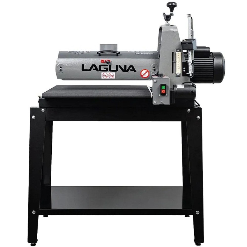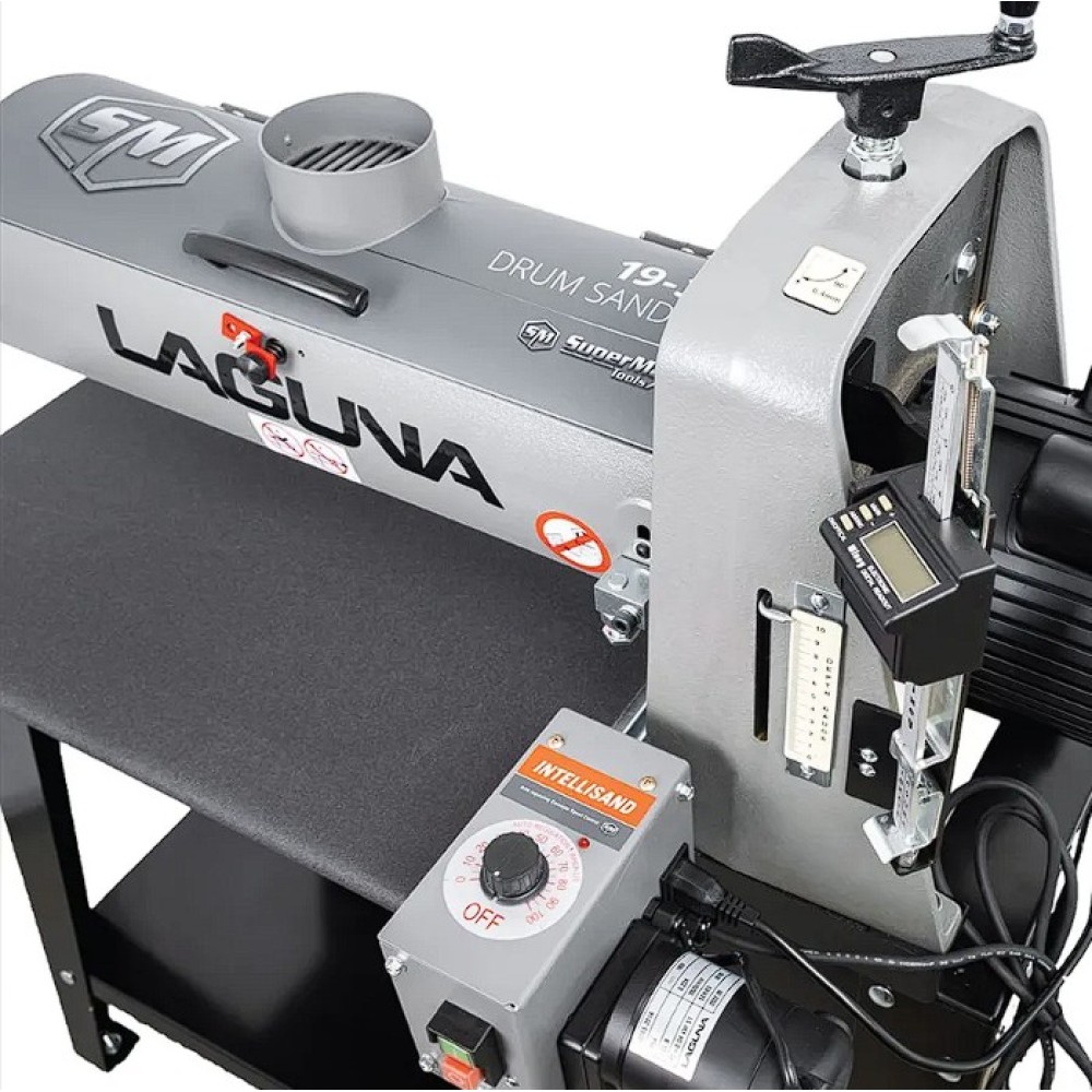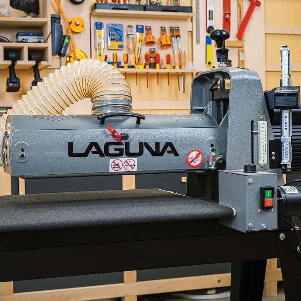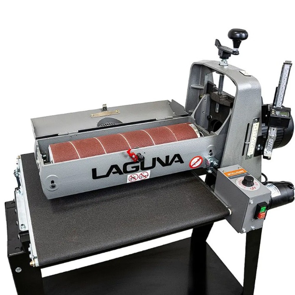 Az IGM Laguna SuperMax hengeres csiszológépet asztalosmesterek segítségével tervezték igényes műhelyek számára, zökkenőmentes működésre, keskeny vagy széles munkadarabok pontos csiszolására és gyors beállítására. Olyan elemeket talál rajta, amelyeket a szakemberek már hosszú ideje kerestek a famegmunkáló piacon. Az egyik ilyen előny például a csiszolási magasság egyszerű beállítása. A kar alatti nyomócsapágy és a felette lévő anya megakadályozza, hogy a henger csiszolás közben elmozduljon. A magasságállító mechanizmusnak nincs holtjátéka vagy billenése, így könnyebb és simább a magasság beállítása. A pontos anyagleválasztást beépített digitális kijelző segítségével lehet ellenőrizni, amely tizedmilliméter pontossággal mutatja a henger magasságát, ezáltal lehetővé téve a pontos érték kiszámítását. A teljes munkadarab szélességén belüli pontosságot nemcsak a merev öntöttvas szerkezet garantálja, hanem a henger és a szállítószalag közötti pontos párhuzamos beállítás is. A csiszológép fel van szerelve egy karral, amellyel be lehet állítani a gépet a széles munkadarabok csiszolásához. Ez a kar kissé megemeli az adagolóasztalt, így elkerülhető a hornyok kialakulása az alkatrésznek a hengeren túlnyúló részén. A vivőszalag önálló motorja a csiszológép hátoldalán található, így a szalag inkább húzva van, nem pedig tolva. A csúszásgátlós abrazív vivőszalagot úgy tervezték, hogy a 482 mm-nél szélesebb munkadarabokat is megfelelően támassza alá (két csiszolási művelet során). Az adagolószalag négy acél keresztmetszettel megerősített, tökéletesen sík acélvezetője 0,25 mm-nél kisebb eltéréssel garantálja a simaságot a csiszológép teljes szélességében. Az Intellisand technológia automatikusan beállítja az adagolási sebességet, ha túl nagy az anyagleválasztás. Az Intellisand csökkenti az adagolási sebességet, hogy megelőzze a motor túlterhelését, és elkerülje a munkadarab megégését, a szálak kitépését vagy más sérülést. A durva felületű adagolószalag szorosan tartja a nyers fát, és lehetővé teszi a nagyon rövid vagy vékony darabok csiszolását is. A csiszológép szabadalmaztatott csiszolószalag-rögzítő rendszerrel rendelkezik, amely megakadályozza a csiszolószalag meglazulását vagy átfedését. A feszesség beállítása így nagyon egyszerű és gyors – semmi speciális szerszám nem szükséges! Egy másik intelligens tulajdonság a speciálisan kialakított hengerfedél, amely hatékonyabbá teszi a csiszolópor elszívását. A burkolat úgy van kialakítva, hogy a tökéletes elszívás érdekében illeszkedjen a henger formájához. Az önhűtő henger megakadályozza a túlmelegedést, és meghosszabbítja a csiszolóanyag élettartamát. A szabályozható nyomógörgők megakadályozzák az eltérő anyagleválasztást az egymást követő csiszolási folyamatok során. A hengeres csiszológép az anyag felületének megmunkálására szolgál. Egyetlen csiszolási művelet során (60-as csiszolóanyaggal) nem szabad túllépni a 0,4 mm-es anyagleválasztást.