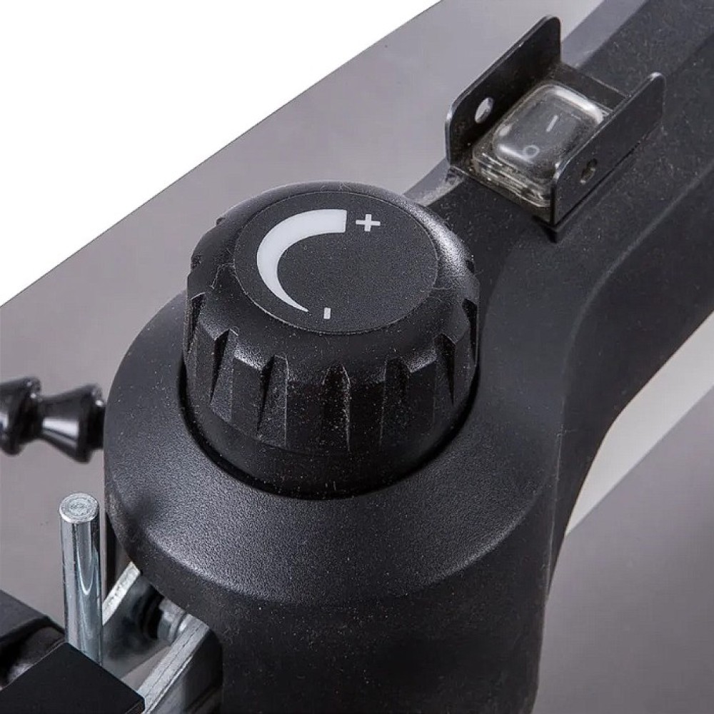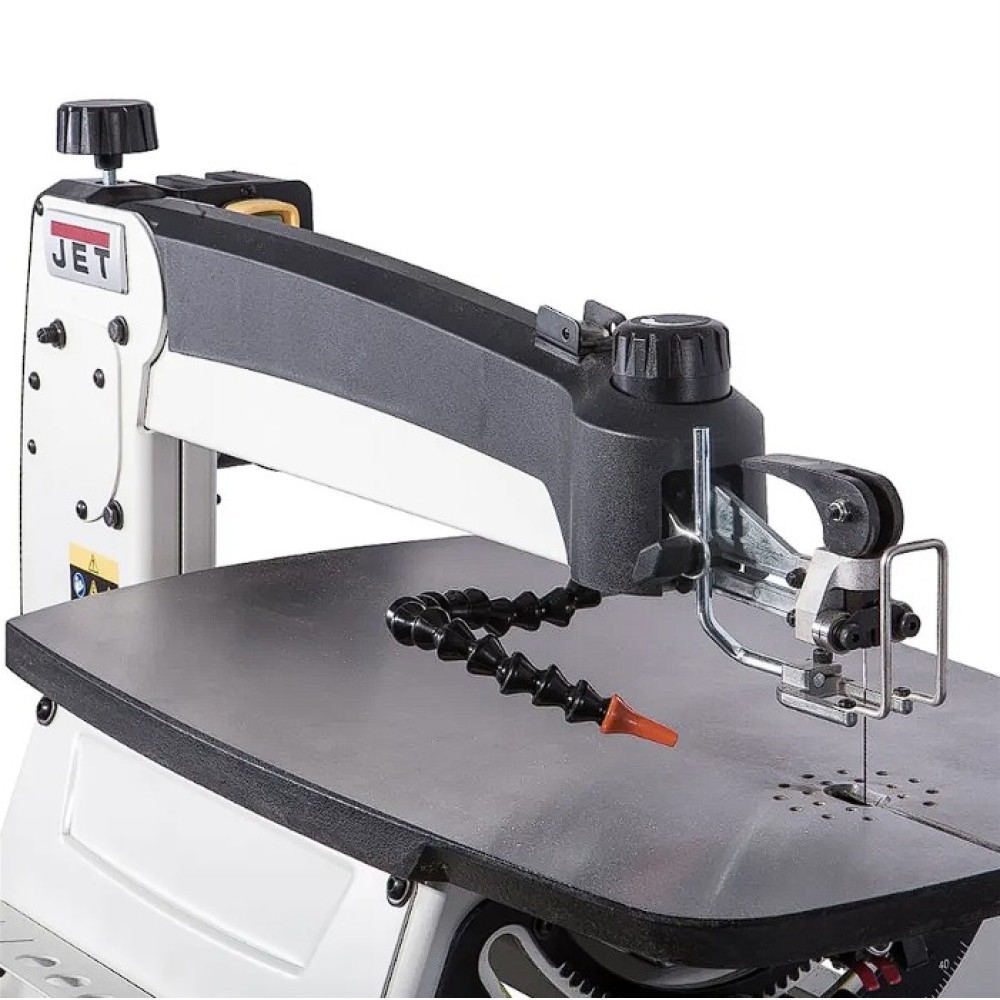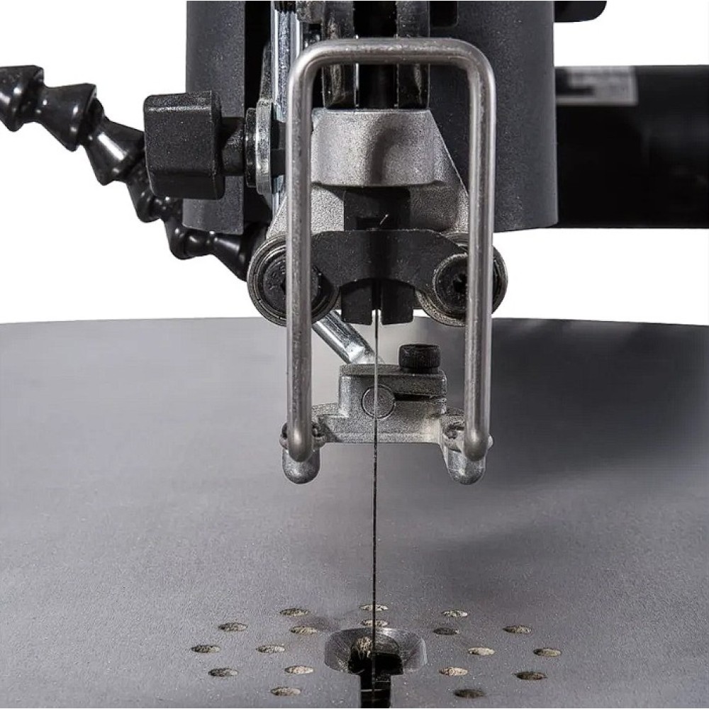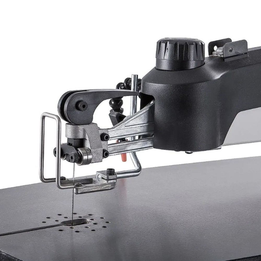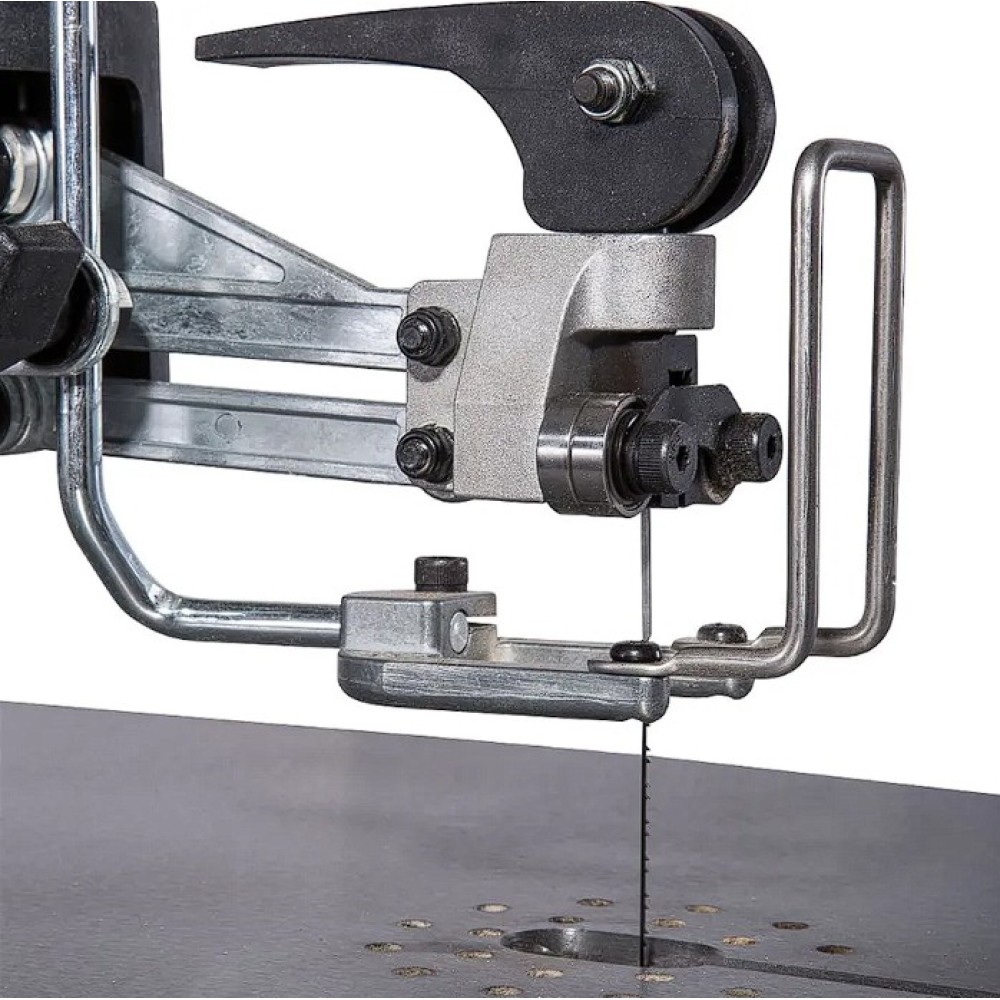 A professzionális felhasználásra tervezett asztali dekopírfűrész olyan igényes felhasználók számára készült, akik pontosságot és könnyű használatot igényelnek. A masszív konstrukció, a pontos mechanizmus, valamint a gép teljes elrendezése és a részletekben rejlő tökéletesség az, ami megkülönbözteti ezt a modellt a többi versenytársától.A gép folyamatos fordulatszám-állítással és forgatható állítható karral van felszerelve, amelyet a munkadarab felszerelésekor használhat ki. A vibrációs mechanizmus alsó pozícióját a fogantyú elforgatásával lehet beállítani, ami nagyobb kihasználhatóságot tesz lehetővé a különböző anyagok és anyagvastagságok használatakor. Ez a professzionális fűrész ráadásul lehetővé teszi az előrezgések beállítását is, ami az agresszívabb és produktívabb vágást biztosítja.Öntöttvas asztal pontos munkát biztosít vibráció nélkül. A szög alatti vágások véghezvitele érdekében döntse meg a fűrészlap karját, így a munkadarab mindig vízszintes pozícióban marad. A dőlésszög-szabályozást egy fogaskerék-mechanizmus segítségével hajtjuk végre, forgó fogantyúval. Szimmetrikus és balra és jobbra is billenthető.A gép csapszeggel ellátott fűrészlapokkal működik, és a csomagolás részei az adapterok is a csapos fűrészlapokhoz. A felső részen a lapokat egy excentrikus mechanizmus rögzíti egy feszítővel kombinálva, az alsó az adapterbe van rögzítve, majd behelyezve a tüskébe.