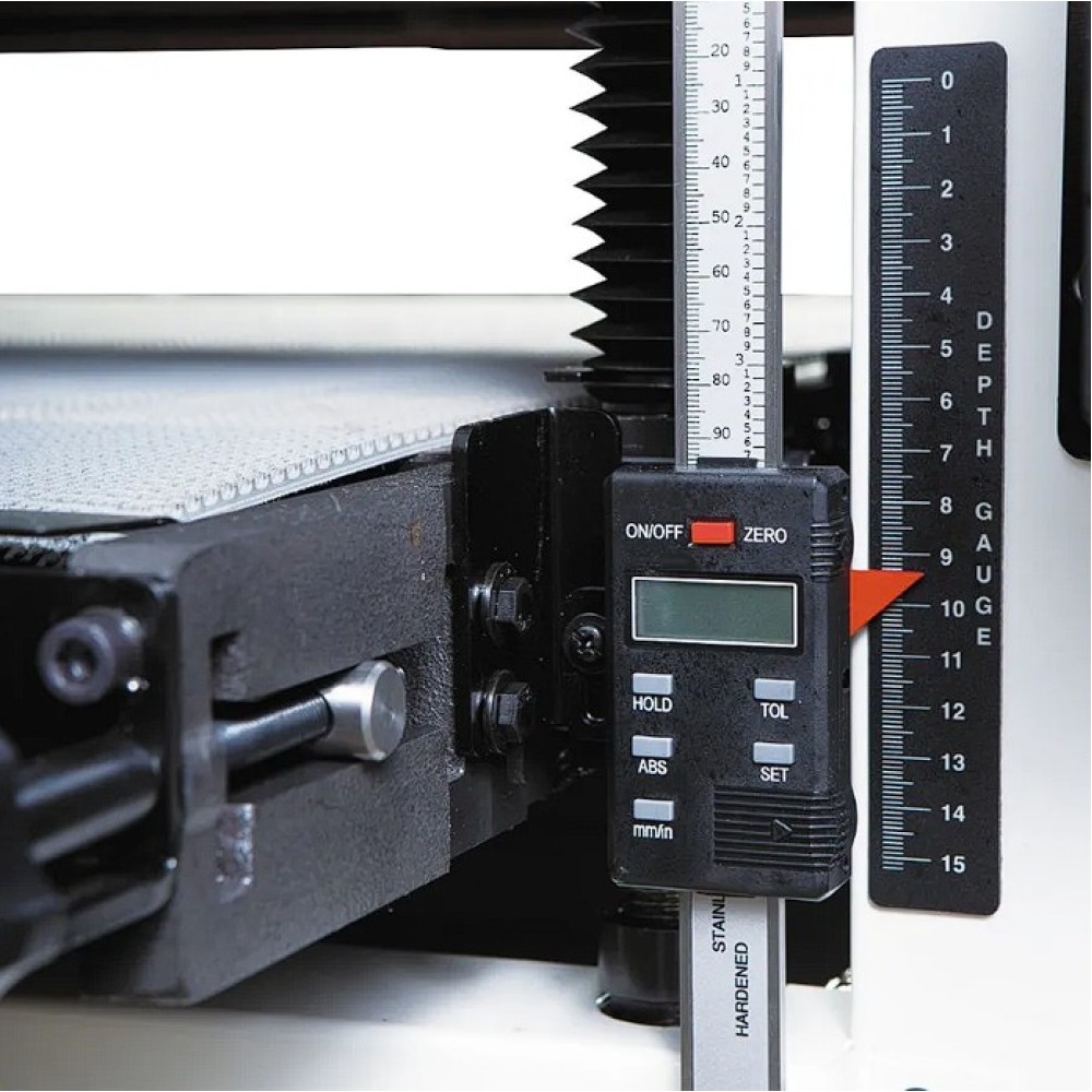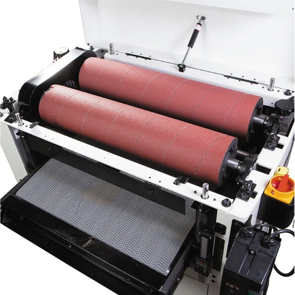 A DDS sorozatú JET kéthengeres csiszoló alkalmas bútordarabok, építőelemek végső felületkezelésére, vagy bármilyen faanyag kiegyenlítésére. Felszerelését tekintve a professzionális gépek közé sorolható, ipari üzembe, mindennapos használatra alkalmas. A kéthengeres csiszoló masszív és erős acélszerkezettel, valamint erős motorral rendelkezik. A két 150 mm-es csiszolóhenger precízen megmunkált duralumínium öntvényből készült, kitűnően kiegyensúlyozottak és gumírozottak. Lehetővé teszik a végső felületkezelést egy menetben. Az első henger durva, a hatékony leszedés érdekében, a hátsó henger finom mikrobeállítású, ezáltal az első hengertől eltérően állítható be, így biztosít csiszolással végleges finom felületet. A 75 mm-es vagy a 100 mm-es csiszolószalag spirálisan tekeredik a csiszoló hengerre és klippek segítségével rögzül, ezáltal egyszerű és gyors csiszolószalag cserét tesz lehetővé. A csiszolószalag alapos rögzítése érdekében a csiszolóhengerek gumival bevontak. A szállítószalag raszteres gumi-textil anyagból készült, motormeghajtású és két-fokozatú sebességváltóval rendelkezik kétsebességes előtolási lehetőséggel a csiszolt anyagtól függően. A faanyagot a szállítószalaghoz három nyomógörgő szorítja, aminek köszönhetően egységes munkaanyag vastagság és biztonságos üzemeltetés érhető el. Masszív szerkezet, erős motor, két csiszolóhenger és a 2 vagy 3 m/perc előtolási sebesség biztosítják a leszedést egy ütemben akár 1,5 mm vastagságig, 0,8 mm-től egészen 133 mm munkadarab vastagságig. Mindkét előtolási sebesség hozzájárul a munkadarab kiigazításához 0,2 mm-es pontossággal a csiszolási felület teljes hosszán. A finom beállítás kézi tárcsával történik a munkadarab vastagságának digitális leolvasásával, ami növeli a munka pontosságát. A két 100 mm-es elszívócsonk kifinomult elszívó csővel a hengereknél alapos porelvezetést biztosít. Egy kifejezetten masszív gépről van szó, amely beruházás gyorsan megtérül abban a műhelyben, ahol naponta nagy mennyiségű csiszolás zajlik. A csomagolás tartalma 80 K finomságú csiszolószalag az első hengerre és 100 K csiszolószalag a második hengerre.