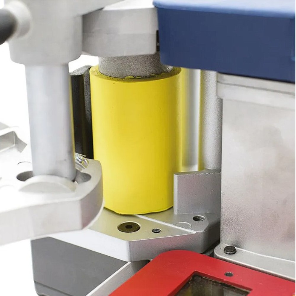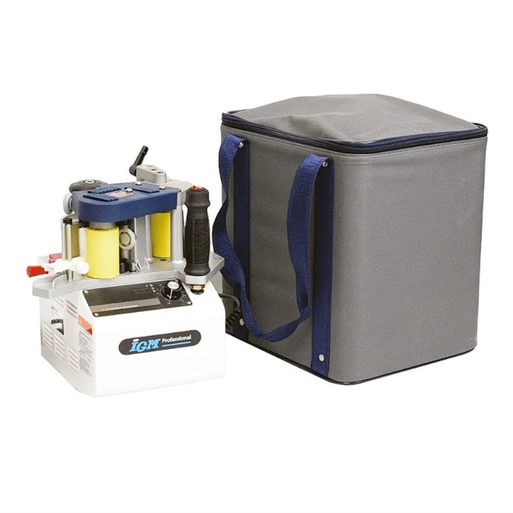 A forradalmian új sorozatú IGM innovatív élfóliázó gépek a 0,3–3 mm ABS, PVC, laminált élfóliák és furnérok gyors felvitelére készültek a 10–65 mm vastagságú egyenes és íves munkadarabokhoz. A ragasztó granulátum olvasztókamrában történő, gyorshevítés általi felolvasztása után, egy innovatív rendszerben kerül közvetlenül az élanyagra, amely ezt követően a gumibevonatú henger segítségével tökéletesen rögzül a munkadarabhoz. A szalag teljes szélességében és hosszában is stabilan rögzül a munkadarab élére. Az eredmény a szalag és a laminált élfólia meggyőzően stabil kötése mindegyik élfóliázónál. Az IGM élfóliázógépek új generációja számtalan egyedülálló, és szabadalmaztatott tulajdonsággal rendelkezik, mely más hordozható élfóliázó gépeknél nem található meg. Az élfóliázó összes része nagyon pontosan kidolgozott és precízen összeszerelt. Épp ezért az IGM élfóliázók garantálják a professzionális felhasználást, hosszú élettartamot, minimális karbantartást és elégedett ügyfeleket. Az élfóliázók legújabb generációja kb. 5 perc alatt felhevíti a ragasztót hideg állapotból. Ha utántölti a ragasztót legalább a tartály feléig, a termosztát a gépet folyamatosan üzemi hőmérsékleten tartja. Az élfóliázó folyamatos ragasztófelhordást biztosít, amely a fogantyún lévő szabályozóval egyszerűen szabályozható. A ragasztófelhordás innovatív rendszere, amely jobb mint a kettős felhordás, mindig pontosan és egyenletesen adagolja a szalagra a ragasztót, kihagyások, túlfolyás vagy a gép szennyezése nélkül. A szalag, egy beállítható leszorító nyomással ellátott speciális vezetőn van a felhordó hengerre vezetve (felbontás 1 mm ), ami lehetővé teszi a szalag pontos és problémamentes rávezetését a felhordó hengerre valamint a ragasztó felhordását a szalagra. A két gumibevonatú ergonomikus fogantyú, lehetővé teszi a gép pontos vezetését a munkadarabon. Az alátámasztó vezető asztal az alsó részéről, egy speciális csúszó-réteggel rendelkezik, amely lehetővé teszi az anyagon történő egyszerűbb mozgást, a megkarcolás kockázata nélkül. A vezető asztal egy mérőeszközzel van ellátva a pontos beállításhoz a deszka vastagsága alapján, amely a stabil tartóban kerül rögzítésre. Az innovációs megdöntő rendszer, ± 15° tartományban biztosítja a ferdére vágott élek pontos élfóliázását is. A ragasztó fedő fogantyúja két pozícióban is elhelyezésre kerülhet, az élfóliázás típusa alapján. A BR500 élfóliázónak modern, digitális szabályozó kijelzője van, a hőmérséklet és a mozgás-sebesség kiválasztásához, amely vízszintesen van elhelyezve, hogy az élfóliázás folyamatát folyamatosan ellenőrzés alatt tudja tartani. Mindig pontosan beállítja az igényelt hőmérsékletet. A hőmérsékleti tartomány 120–200°C ± 1°C terjed. A mozgási sebesség a fogantyún, az élfóliázás optimális sebessége és a praktikus kezelés érdekében, 2-6 m/perc tartományban, folyamatosan állítható.