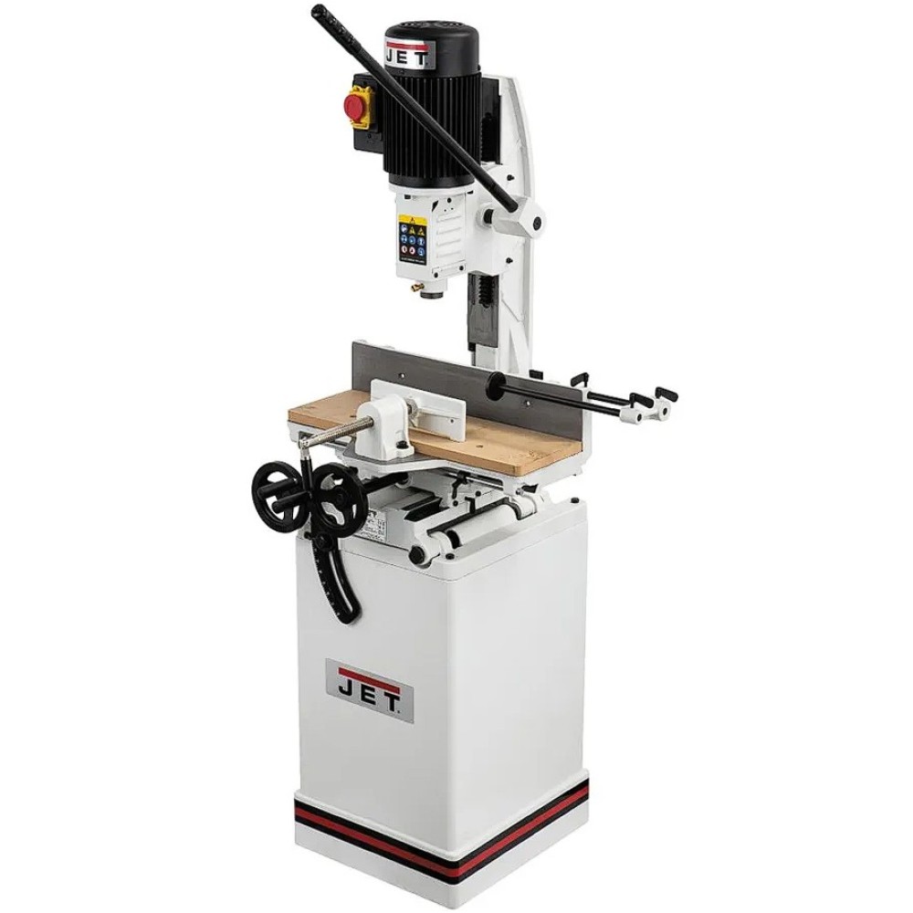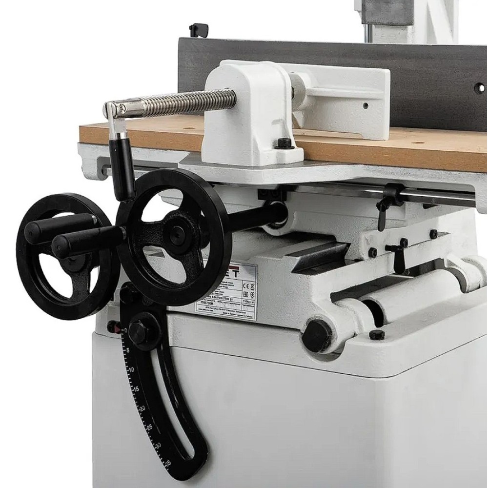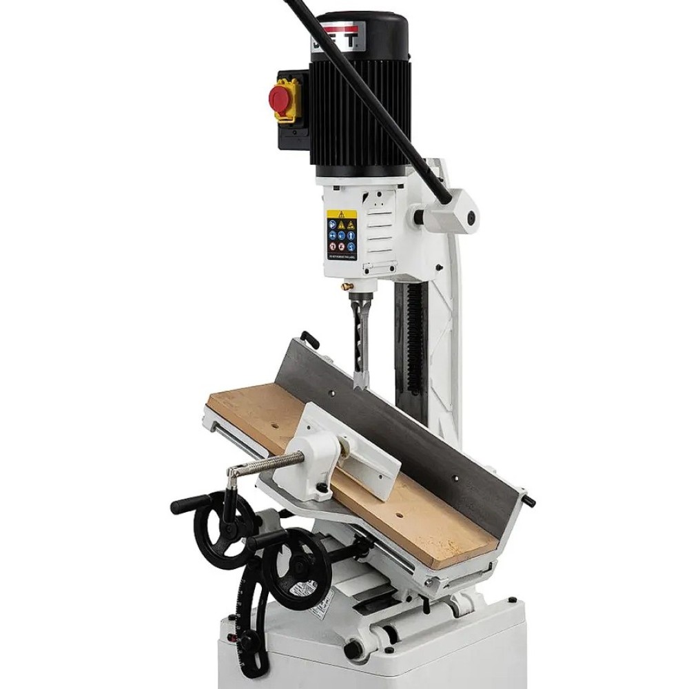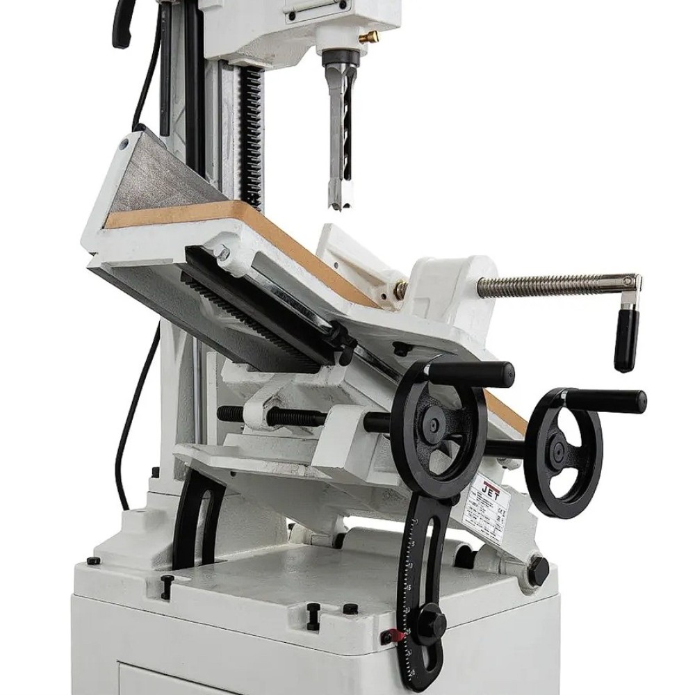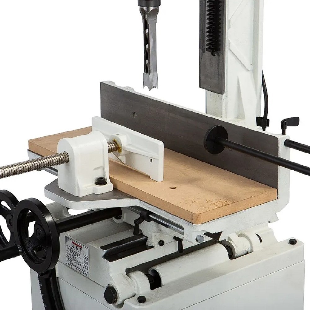 A professzionális JET 719AS fúró-vésőgép robusztus öntöttvas asztallal, valamint zárható tároló talapzattal rendelkezik. A nagy teljesítményű 1300 W-os motor 25 mm széles vésőhüvelyek létrehozását teszi lehetővé. Az asztal mozgatása két kerékkel van bebiztosítva, egy a hosszanti irányú, másik a keresztirányú mozgásért felel. A precíziós menetes rudaknak köszönhetően a fúróhüvelybe való beillesztés zökkenőmentes mozgást tesz lehetővé. Természetesnek számítanak az ütközők, melyek lehetővé teszik a munkadarab pontos vésését. Az asztal MDF lappal, acél vonalzóval és hosszanti ütközővel rendelkezik, mely lehetővé teszi a gyorsan beállítható sorozatgyártást. A JET 719AS model rendelkezik dönthető öntöttvas asztallal, amely könnyű szög allati vésést biztosít. Az asztal hátsó részén található egy skála, amely az ütközőkkel kombinálva gyors összerendezést biztosít a pontos véset érdekében. Az orsó és a motor súlya gáztompító segítségével van kiegyensúlyozva. A fel- és lemozgatást két ütköző korlátozza, melyet szükség szerint állíthat be. A fúró-vésőgépet befoghatja a 19mm és 20,6mm-es vésőhüvelyekbe. A központi fúró 13 mm-es tokmányba van befogva. Egyedi tulajdonság, amelyet a fúró kínál a 180°-al elfordítható orsó. Ez lehetővé teszi a már kész ajtókba való zár vésését bonyolult manipuláció nélkül. A fúró-vésőgépek szögletes vésetek készítésére használatosak. A négyszög alakú hüvely közepén lévő szerpentin fúrószár először egy kerek lyukat fúr, majd az éles szélű hüvely kivágja a széleket a fúrt lyuk körül. A szerpentin fúrót az orsó hajtja, míg a szöghüvely rögzítve van. A sarkak kivágása a négyzet alakú hüvely anyagba húzásával történik.