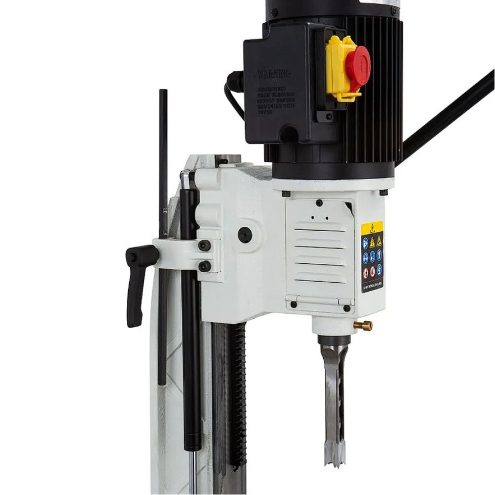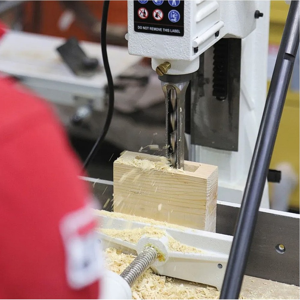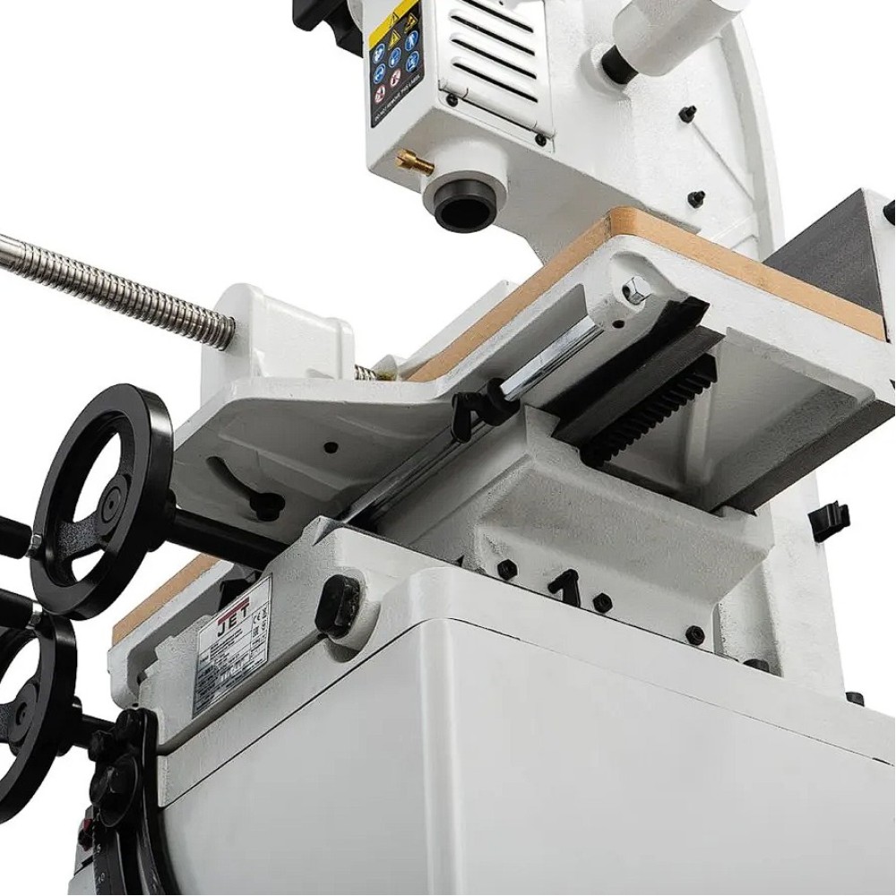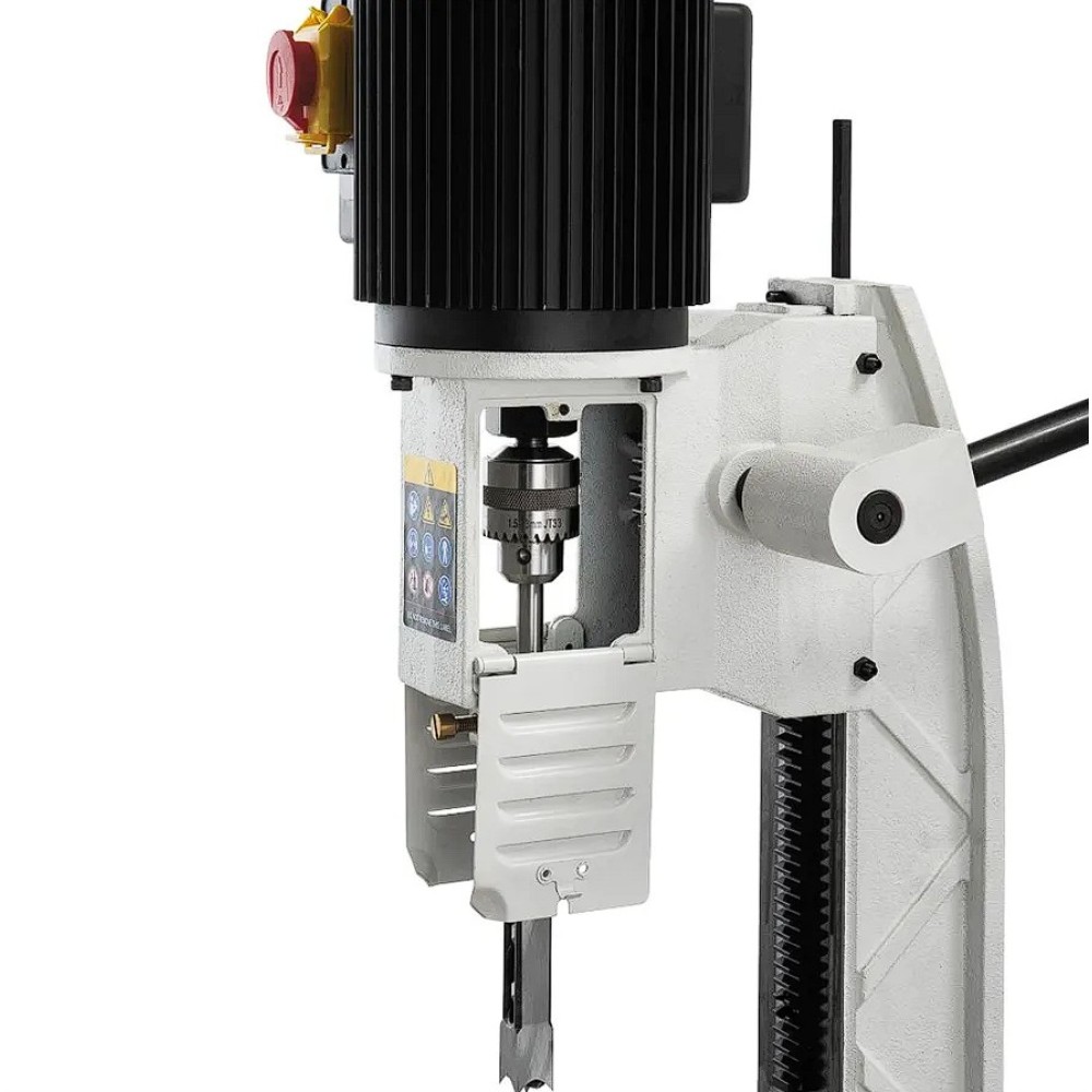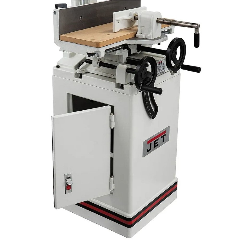 A professzionális JET 719AS fúró-vésőgép robusztus öntöttvas asztallal, valamint zárható tároló talapzattal rendelkezik. A nagy teljesítményű 1300 W-os motor 25 mm széles vésőhüvelyek létrehozását teszi lehetővé. Az asztal mozgatása két kerékkel van bebiztosítva, egy a hosszanti irányú, másik a keresztirányú mozgásért felel. A precíziós menetes rudaknak köszönhetően a fúróhüvelybe való beillesztés zökkenőmentes mozgást tesz lehetővé. Természetesnek számítanak az ütközők, melyek lehetővé teszik a munkadarab pontos vésését. Az asztal MDF lappal, acél vonalzóval és hosszanti ütközővel rendelkezik, mely lehetővé teszi a gyorsan beállítható sorozatgyártást. A JET 719AS model rendelkezik dönthető öntöttvas asztallal, amely könnyű szög allati vésést biztosít. Az asztal hátsó részén található egy skála, amely az ütközőkkel kombinálva gyors összerendezést biztosít a pontos véset érdekében. Az orsó és a motor súlya gáztompító segítségével van kiegyensúlyozva. A fel- és lemozgatást két ütköző korlátozza, melyet szükség szerint állíthat be. A fúró-vésőgépet befoghatja a 19mm és 20,6mm-es vésőhüvelyekbe. A központi fúró 13 mm-es tokmányba van befogva. Egyedi tulajdonság, amelyet a fúró kínál a 180°-al elfordítható orsó. Ez lehetővé teszi a már kész ajtókba való zár vésését bonyolult manipuláció nélkül. A fúró-vésőgépek szögletes vésetek készítésére használatosak. A négyszög alakú hüvely közepén lévő szerpentin fúrószár először egy kerek lyukat fúr, majd az éles szélű hüvely kivágja a széleket a fúrt lyuk körül. A szerpentin fúrót az orsó hajtja, míg a szöghüvely rögzítve van. A sarkak kivágása a négyzet alakú hüvely anyagba húzásával történik.