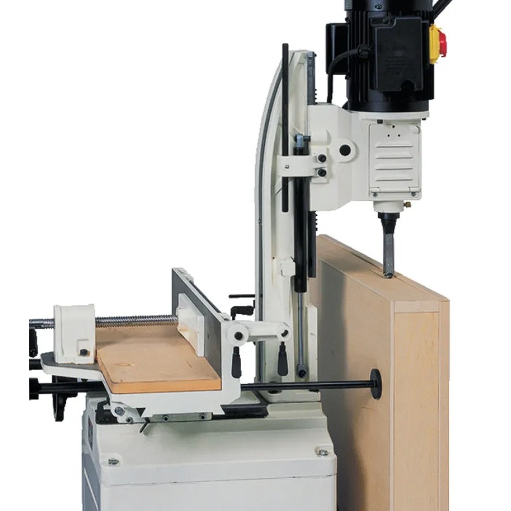 A professzionális fúró-vésőgép masszív, öntöttvas asztallal és zárható alsó tároló állvánnyal rendelkezik. Az erős 1300 W motorral akár 25 mm széles furat is véshető. Az asztalmozgatás két kerékkel történik hossz, ill. oldalirányban. A felület minőségének teljes védelmét a menetes rudak biztosítják. A végütköző segíti a munkadarabra a fúró pontos ráhelyezését. MDF munkaasztal, acél vonalzó és gyors állítású végütköző a sorozatgyártáshoz. Az asztal hátsó oldalán található skála együtt az ütközőkkel gyorsbeállítást biztosít a pontos furatokért. A tengely- és a motorsúlyt gázrugó egyenlíti ki. A felfelé és a lefelé történő mozgatást szükség szerűen állítható ütközők segítik. A fúró befogható 19 mm vagy 20,6 mm hengeres házba. A központi fúró 13 mm-es tokmányba van befogva. További egyedi tulajdonsága a tengely 180 fokban történő forgási lehetősége, amivel készajtókba biztosít könnyed zárhelyvésést.