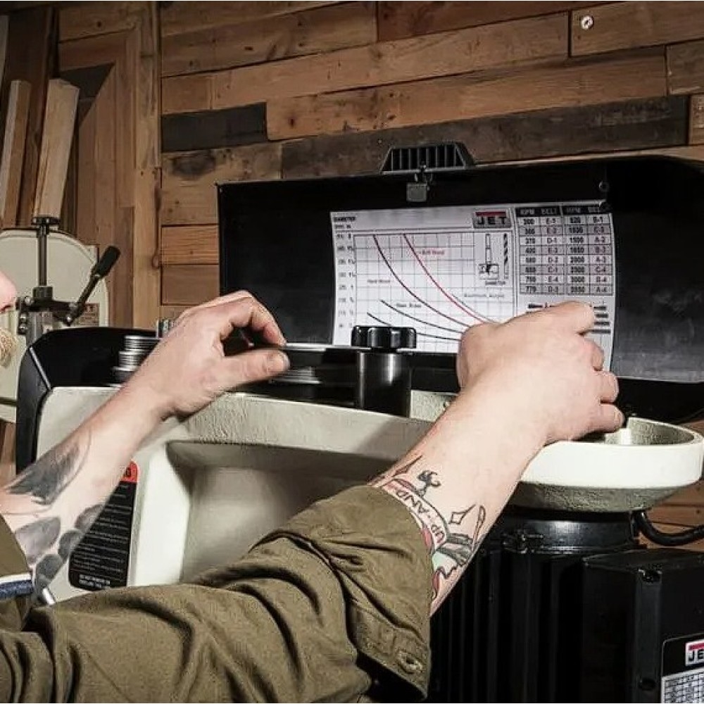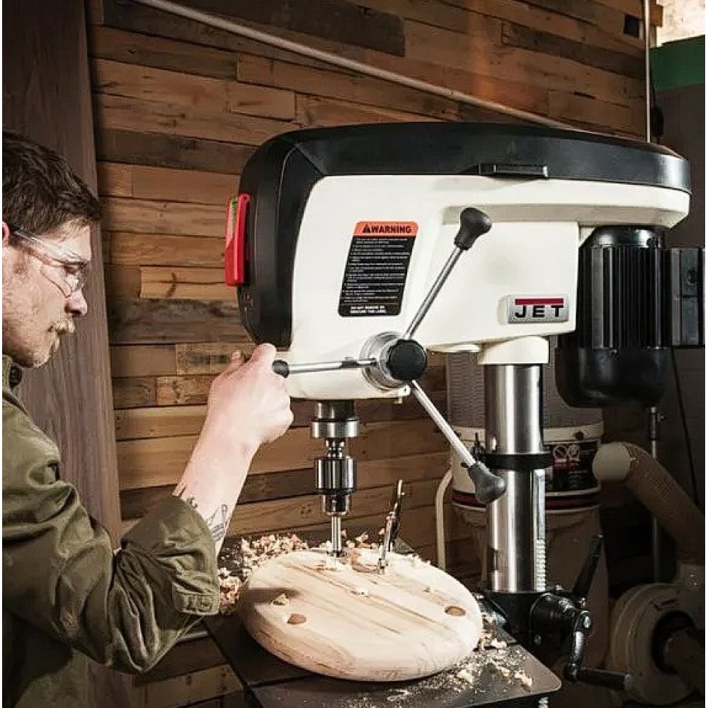 A Jet JDP-15B egy asztali oszlopos fúrógép speciálisan fával való munkára tervezve. Fő jellemzői ennek a fúrógéppnek a 80 mm hosszú menet fogantyú egy elfordításával és integrált mélységütközővel fúrás ismételt pontosságáért. Hatékony ékszíjak biztosítják a fúrást vibrációk nélkül maximális teljesítmény átvitellel a tengelyre. Szíj gyors felfeszítésének rendszere áll rendelkezésére szerszámok használata nélkül, amely fordulatszám tartomány egyszerű és gyors változtatását teszi lehetővé. A szíj felső borítása mágnesesen van rögzítve és biztonsági kapcsolóval rendelkezik. Az asztal extra nagy munkafelületet biztosít. Megmunkált öntvényből készült és egyszerű rögzítésért két T-horonnyal van ellátva és középső magasságban állítható betéttel. A pontos asztal 45 ° dönthető mindkét oldalra és beállítható úgy is, hogy pontosan merőleges legyen a tokmány tengelyére. Az asztal magassága fogaskerék segítségével történik és a vezérlőkar az asztaltól el van különítve. Az erős indukciós motor szilárdan a konstrukcióhoz van rögzítve, így megakadályozva az elhajlást és vibrációkat. A világos LED munkalámpa az orsóház öntvényébe van ágyazva, továbbá lézeres jelölő áll rendelkezésre a fúrás középpontjának pontos beállításáért. A mélységütköző komplex rendszere zárt nyílások pontos fúrását teszi lehetővé. Ez a gép úgy volt tervezve, hogy teljesítse famegmunkálók szigorú elvárásait, elég nagy legyen a munkafelülete, maximális legyen a fúrási mélysége és masszív legyen a felépítése. Az orsó sima futása, sok egyedi funkció és részlet helyezi első helyre a konkurencia elé ezt a fúrógépet.