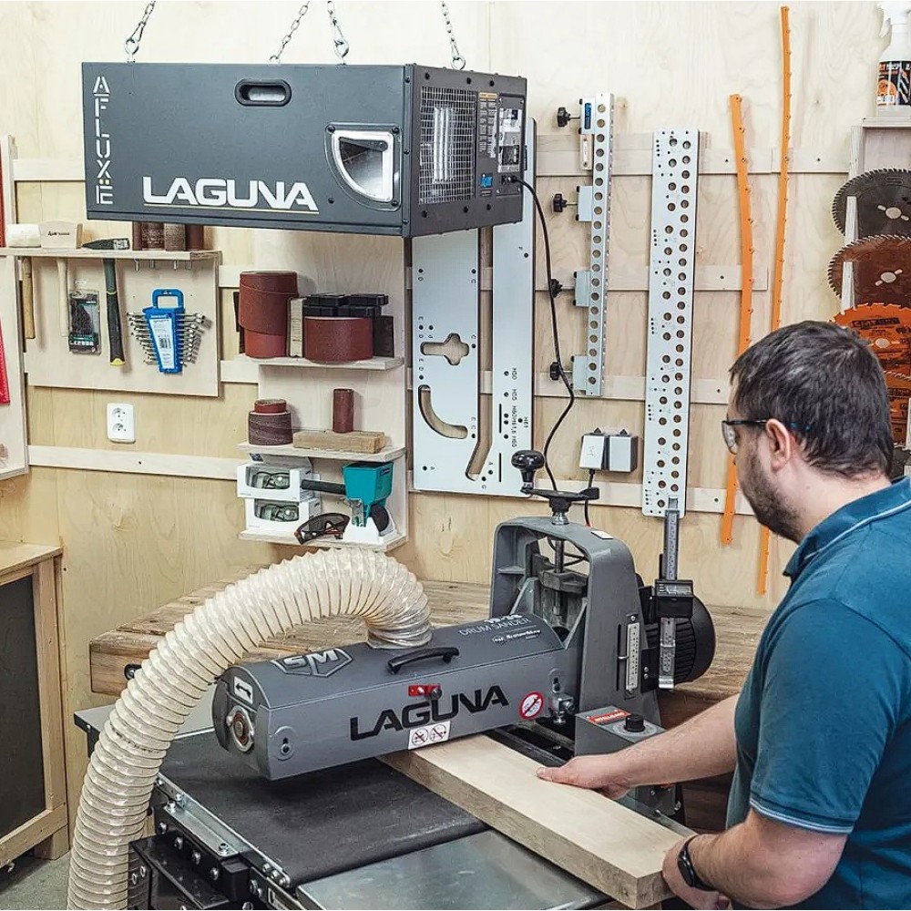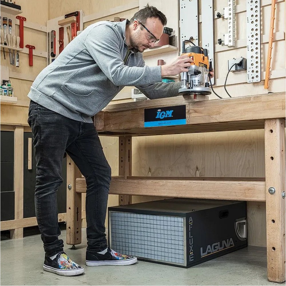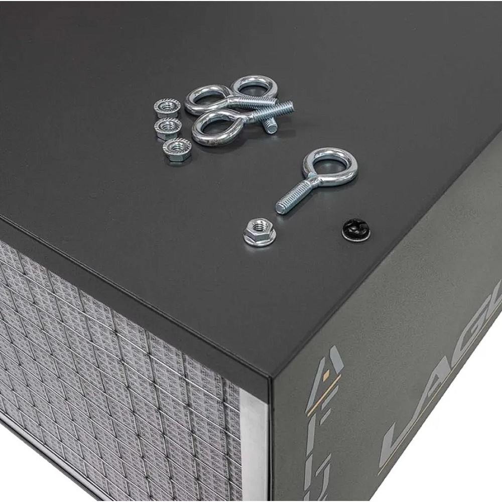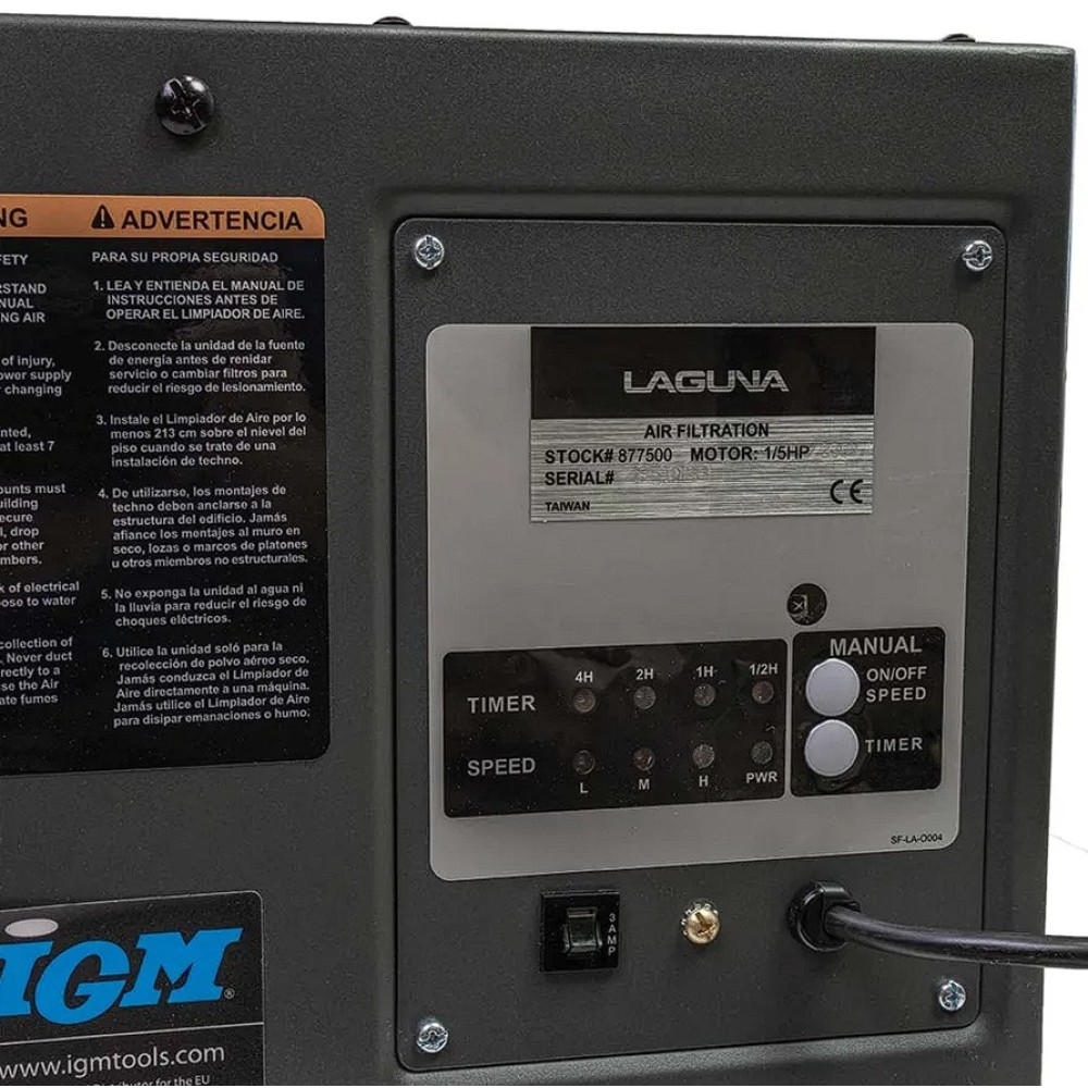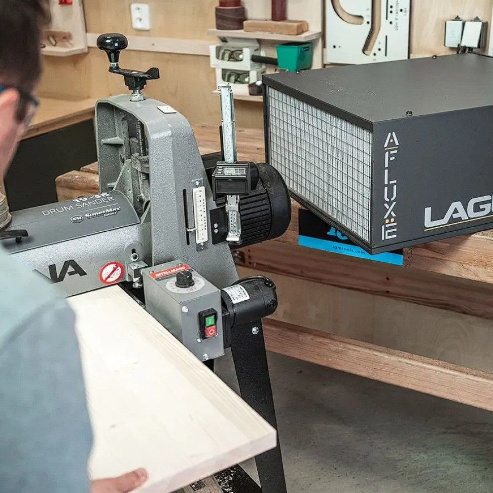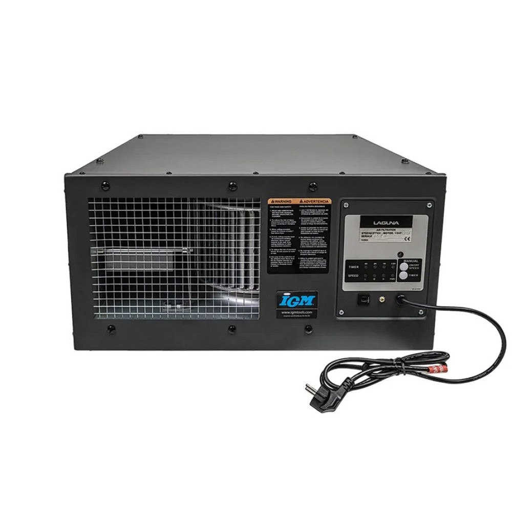 Ideális légszűrő a nagyobb műhelyek légterében lévő por minimálizálására. Ez a szűrő egység úgy van megtervezve, hogy a 6 X 6 X 2,5 m méretű műhely levegőjét óránként 22-szer szűrje át a legnagyobb légáramlat sebessége mellett. A poros nem tisztított levegő két szűrőn van szűrve. A külső elektrosztatikus szűrő minden 5 mikronnál nagyobb részecskét felfog, és sűrített levegővel tisztítható. A nagyobb tisztítási hatékonyság érdekében hideg vízzel is öblíthető. A hatékonyabb szűrés érdekében három zsebbel ellátott belső szövetszűrő 1 mikronos méretig felfogja a részecskéket, így biztosítva a tiszta, szálló portól mentes levegőt. Az egységen légáram jelzőt is talál, amely a szűrő szennyezettségét mutatja. A jelzés megjelenésekor meg kell tisztítani, vagy ki kell cserélni. Az egység 150 W teljesítményű motorral van felszerelve, amely rendkívül nagy légáramot biztosít három fokozatban: 917, 1240 és 2038 m3/óra. Még egy igazán nagy műhelyt is nagyon gyorsan meg lehet tisztítani a szálló portól. Egy 10 x 10 x 4 méter belmagasságú műhely levegőjét maximális kapacitásig közben 12 perc alatt tisztítja meg. Ha a távirányítón keresztül 1/2, 1, 2 és 4 órára állítja be az időzítőt, akkor nyugodtan elhagyhatja a műhelyét, mert biztos lehet benne, hogy a szűrő tökéletesen megtisztítja a levegőt, majd automatikusan kikapcsol