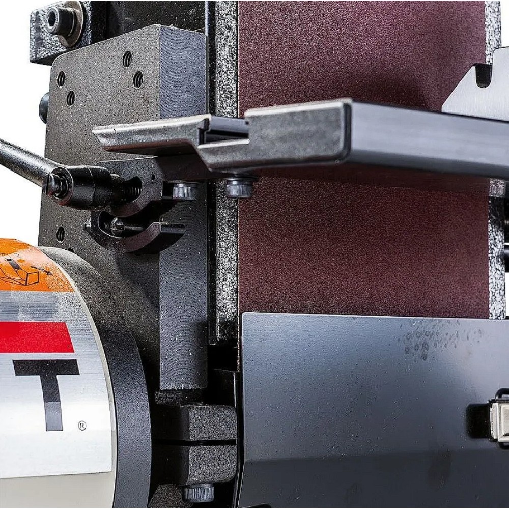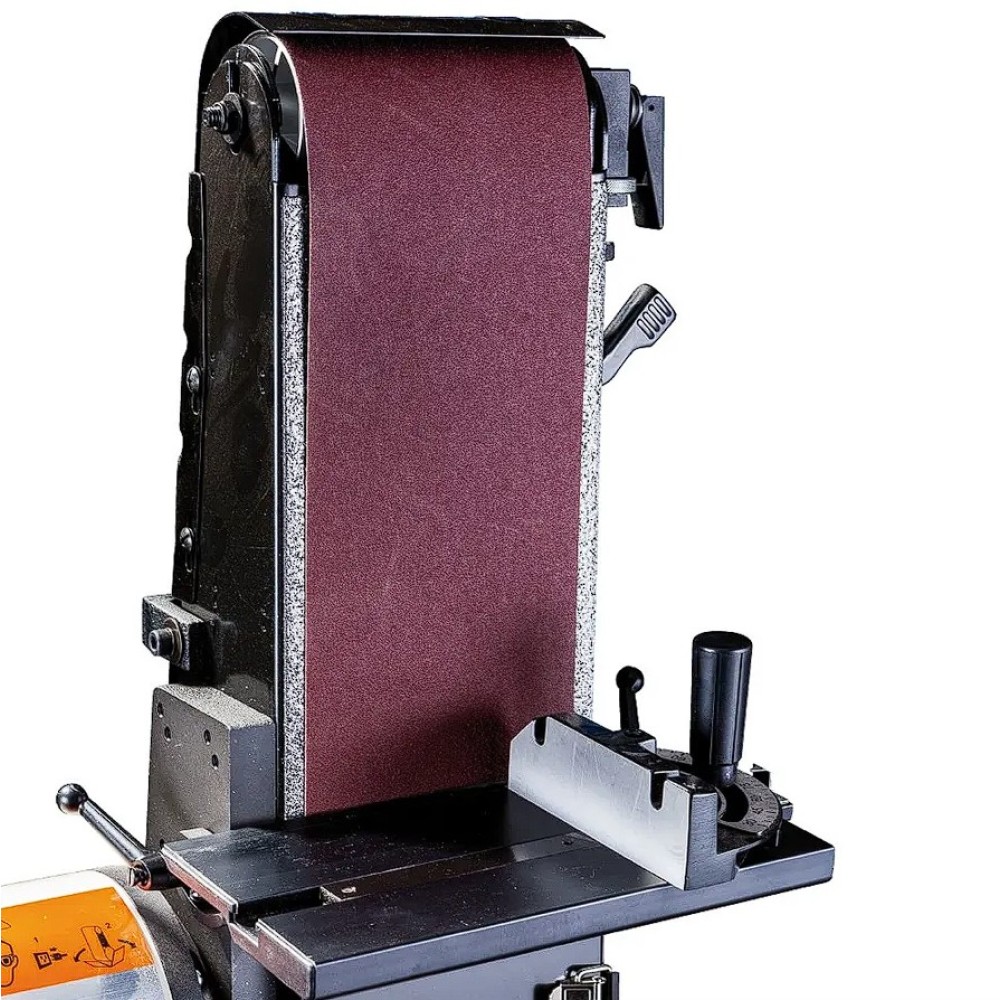 A kombinált csiszológép csiszolótárcsája félig fedett, precízen csiszolt, 45°-ban dönthető öntöttvas asztallal rendelkezik. A derékszögben elhelyezkedő két T-nyílás a derékszög, illetve szögütköző felfogására szolgál. Az integrált elszívó az elszívócső áthelyezése nélkül hatékony elszívást biztosít a gép mindkét oldalának használatakor. A gép szerelhető asztalra, vagy a külön megvásárolható tárolóval ellátott állványra.