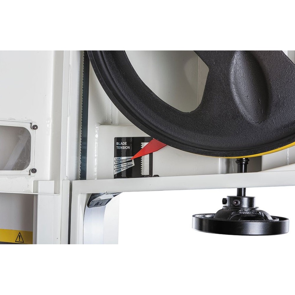 - Fogazott fogasléccel és kézikerékkel állítható, nagy teherbírású vezetőoszlop a fűrészlap optimális alátámasztása érdekében